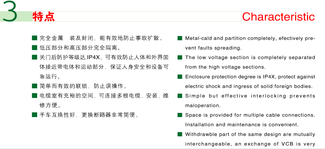 KYN28-12型户内式金属铠装抽出式开关设备(以下简称开关设备),系3~12千伏三相交流50HZ单母线及单母线分段系统的成套配电装置。主要用于发电厂、中小型发电机送电、工矿企事业配电及电业系统的二次变电所的受电、送电及大型高压电动机起动等。实行控制保护、监测之用,本开关设备满足DL/T40491,IEC298、GB3906等标准要求,具有防止带负荷推拉断路器手车、防止误分合断路器、防止接地开关处在闭合位置时关合断路器、防止误入带电隔室、防止在带电时误合接地开关的联锁功能,即可配用VS1真空断路器,又可配用ABB公司的VD4真空断路器。实为一种性能优越的配电装置。